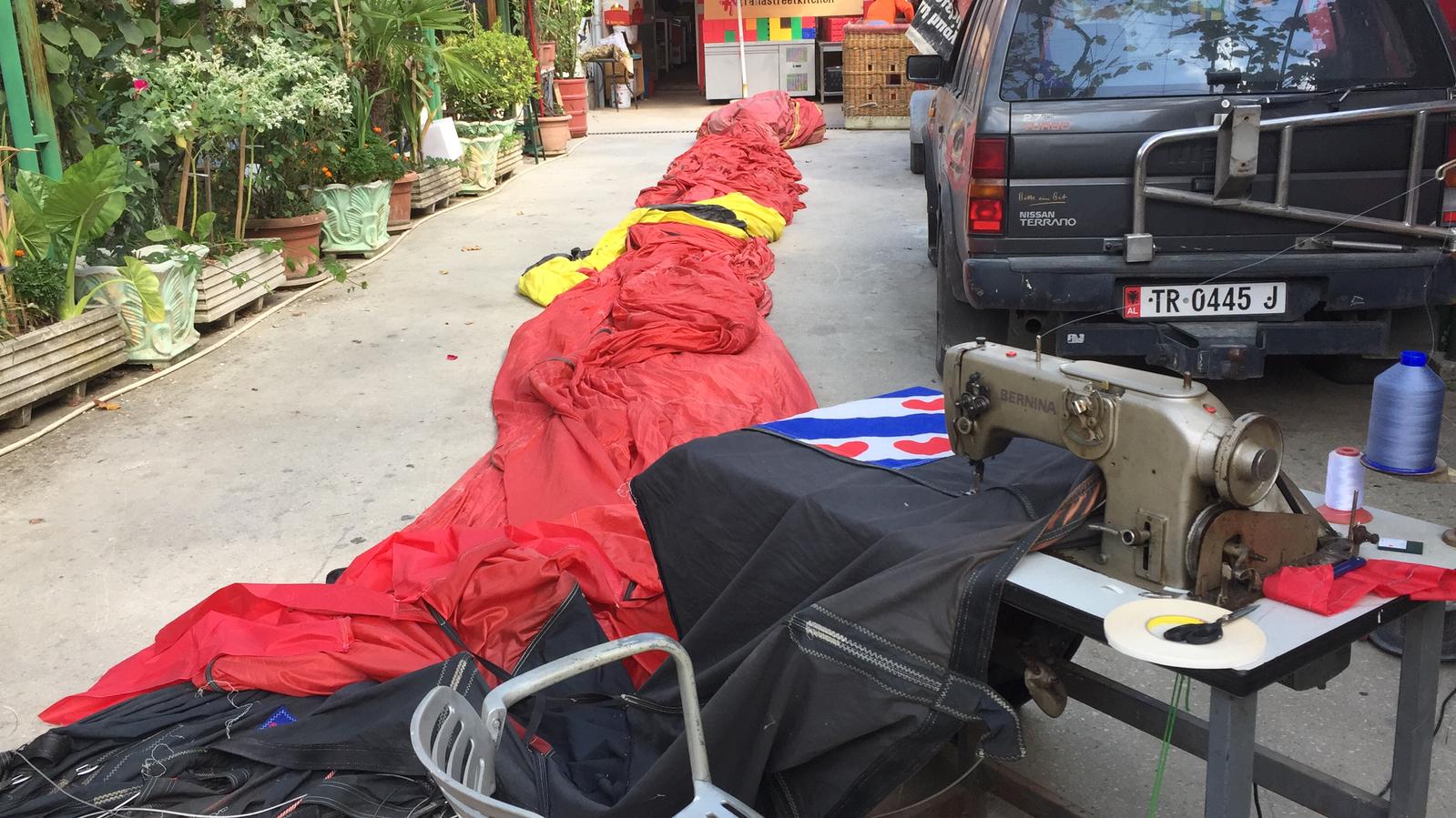 Dus vlogen we met een tas gereedschap en rode ballonstof naar Albanië. De naaimachine was een beetje ouderwets maar goed genoeg om mee te kunnen werken. Uran Qylafku, de eigenaar van de Smile ballon droeg zorg voor de inwendige mens, als kok verzorgde hij overheerlijke lunches. En maakte zo het verblijf voor Pieter zeer aangenaam, hij komt graag terug 😉